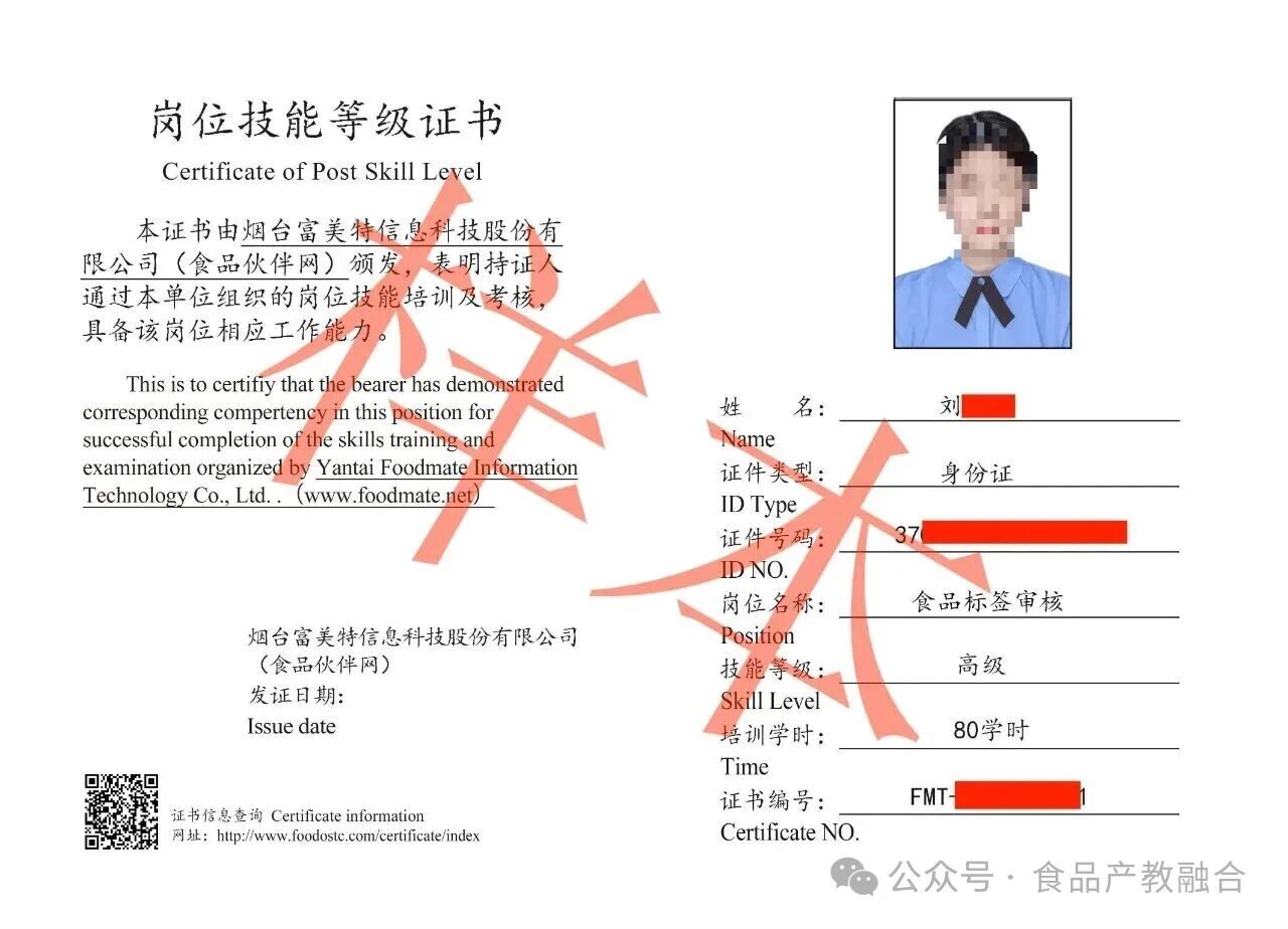 “食品标签审核岗位技能证书”是由烟台富美特信息科技股份有限公司(食品伙伴网)颁发,可在食品伙伴网证书查询中心https://www.foodmate.net/train/cert.php或食品行业职业技能培训中心网站http://www.qzjfjb.cn/可查,同时可作为培训学时证明。